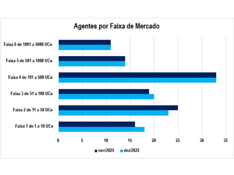 - A Faixa 4 (de 101 a 500 UCs) permanece como a mais representativa do mercado, com 33 agentes, indicando forte concentração no grupo intermediário;